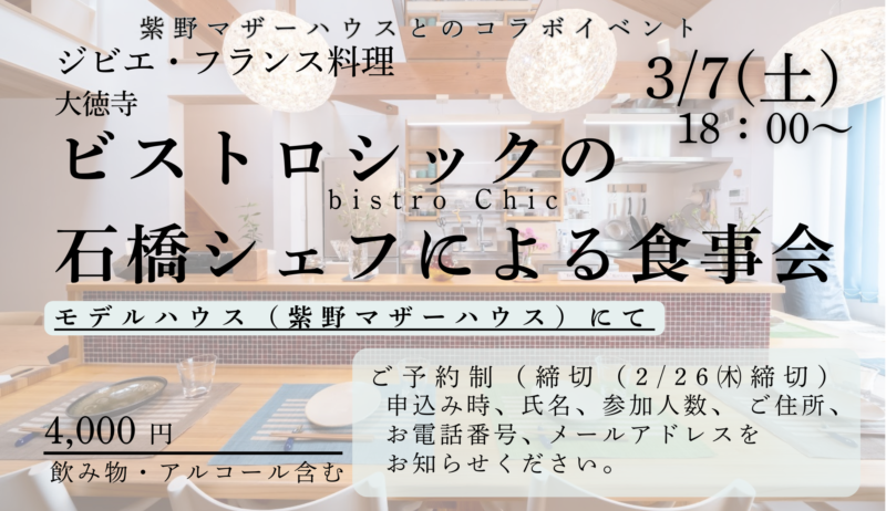 ビストロシックの石橋シェフによる食事会~紫野マザーハウスとのコラボイベント~ 3/7(土)18:00~