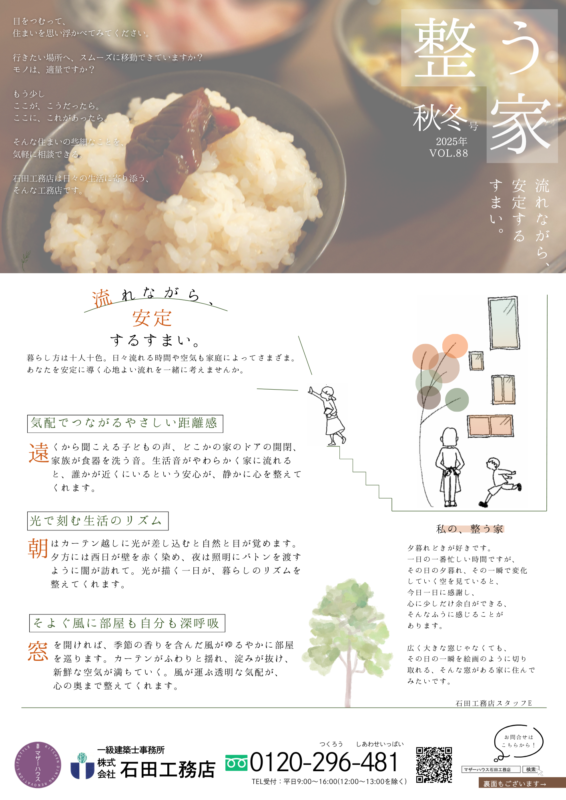 裏面には、「ごはんづくりと空間づくり講座」の開催レポートや弊社イベント「住まいの見学会」「整うヨガ体験」など掲載しております。