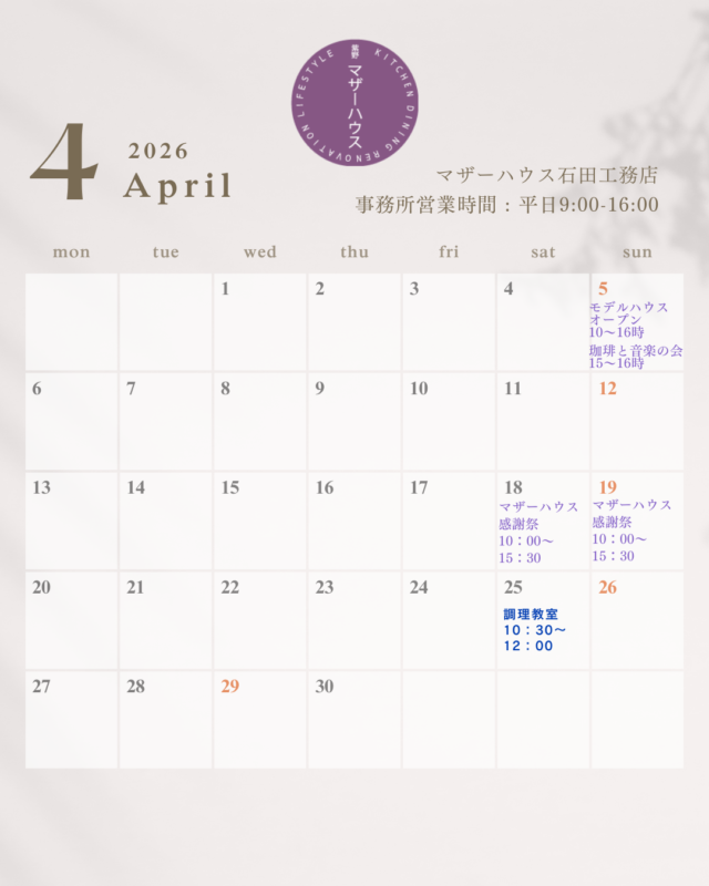2026年4月カレンダー モデルハウス「紫野マザーハウス」でのイベント