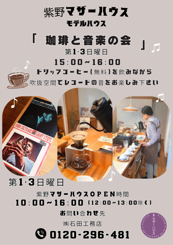 第3日曜日 15:00~16:00は、モデルハウスにて「珈琲と音楽の会」を開催いたしますので、ご家族やご友人をお誘い合わせのうえ、ぜひご参加くださいませ。