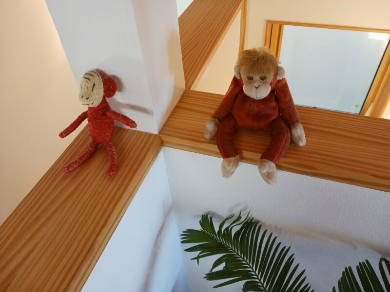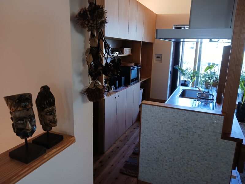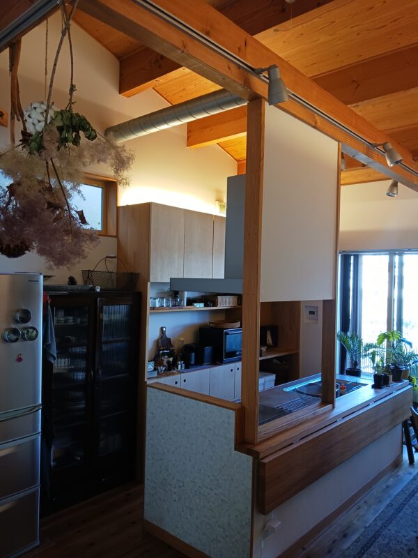 天然木はいい色目に変わり、塗り壁に温かく包み込まれるます。