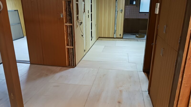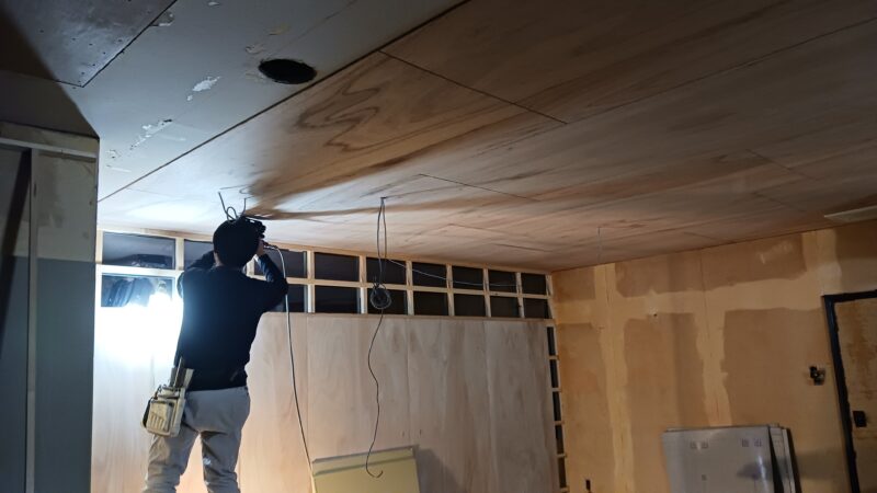 内部は床仕上げの下地として合板を入れ、より頑丈にしていきます。