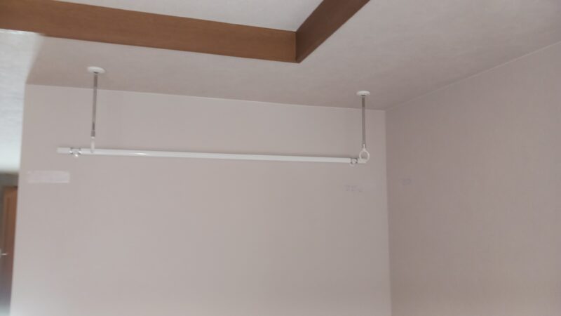 まずは二階から。二階リビングは明るい印象の全体的にやさしいベージュのクロスで仕上げています。物干しポールも設置し、部屋干しが快適にできるようにしました。