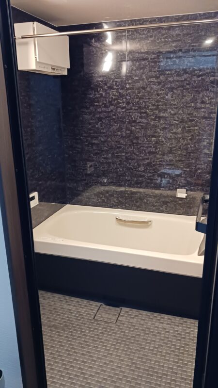 一階の浴室はシックで落ち着いた印象をお希望されておりイメージ通りの空間と肩湯のある浴槽を入れ、ゆっくりすごせることと思います。