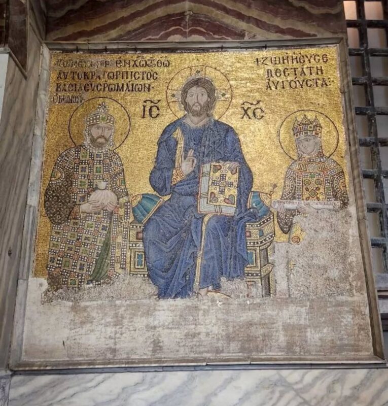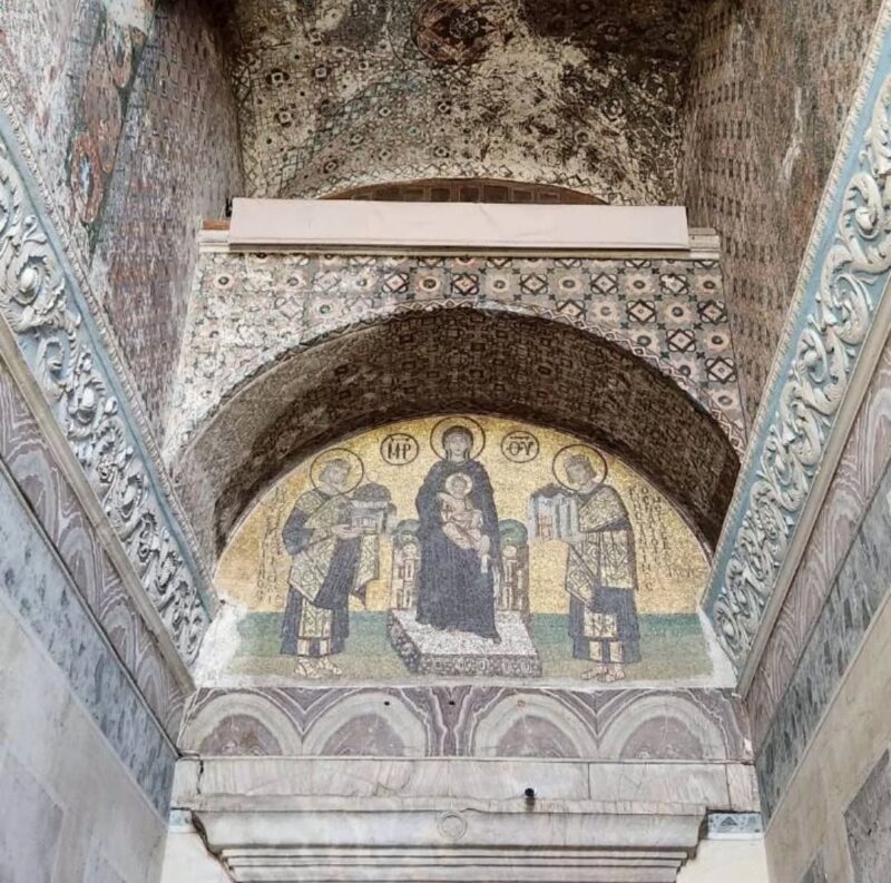 左側ユスティニアヌス帝がアヤソフィアをもち、右側コンスタンティヌス帝がコンスタンティノープルの街(現在のイスタンブール)をもち、聖母マリアにわたしているのだと現地のガイドさんが教えてくれました。