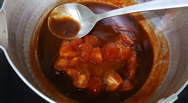 ソースにはバルサミコ酢、ケチャップ、味の花、ポン酢、湯むきミニトマトを入れて。