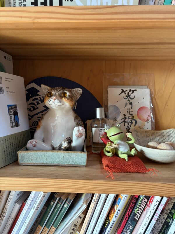 柔らかな表情の猫とリラックスしすぎなカエルの置物に少し癒されます。
